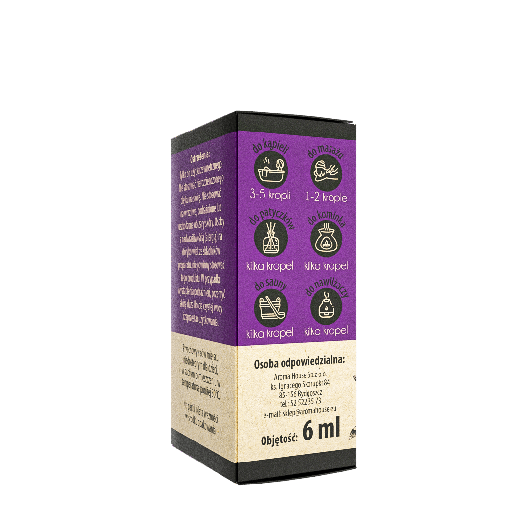 - Właściwości relaksujące: Zapach skutecznie sprzyja **redukcji napięcia i wyciszeniu**. Mniejsze dawki poprawiają nastrój, podczas gdy większe działają uspokajająco.